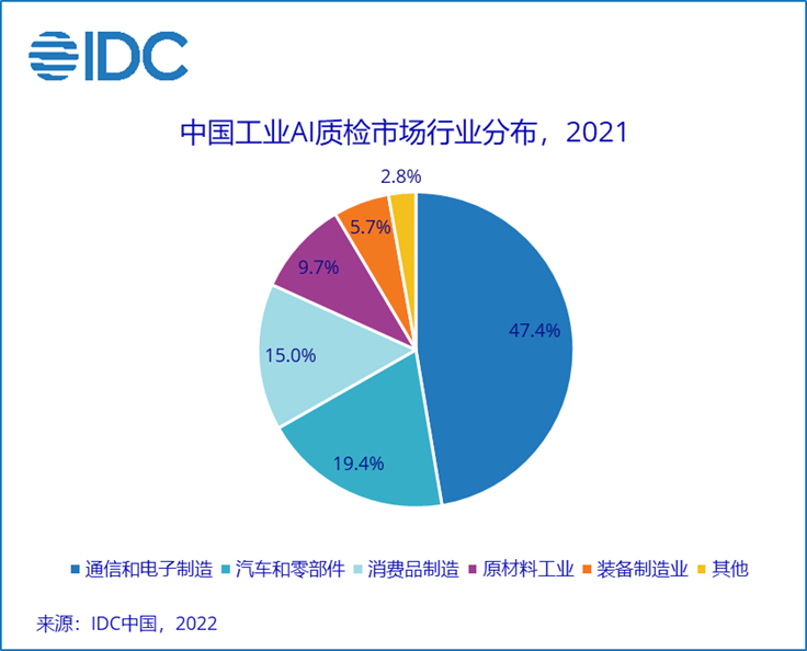 IDC表示,目前,工业AI质检已经从前几年的试点应用,走向规模化复制推广,其中,通信和电子制造、汽车及零部件、消费品和原材料4个行业是目前工业AI质检的主要应用行业,合计占据了91.5%的市场空间,且新的应用场景也在不断涌现。