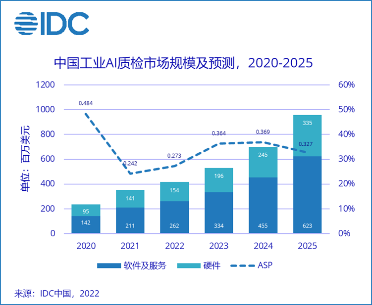 近日,IDC发布了《中国AI赋能的工业质检解决方案市场分析,2022》报告,该报告对工业AI质检产品形态、各重点行业应用进展等方面进行了分析,并指出,工业AI质检市场仍有数倍空间,预计2025年中国工业AI质检整体市场将达到9.58亿美元(约合人民币62亿元),2021-2025年CAGR为28.5%。此外,报告还将亚博科技列入“专精特色企业或值得关注的新兴势力”。